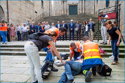 El programa «Acude e Axuda» es una de las herramientas con las que cuenta el Servicio Gallego de Salud (Sergas) para garantizar la asistencia precoz a la parada cardiorrespiratorira a toda la población con la ampliación del programa Acude y Ayuda a toda la Comunidad Autónoma. Con el objetivo de reafirmar la importancia de este programa, en el que el Sergas participa a través de la Fundación Pública Urgencias Sanitarias de Galicia-061, el conselleiro de Sanidad, Jesús Vázquez Almuiña, asistió esta maná en la Plaza Mayor de Ourense a un simulacro basado en la asistencia a una persona que sufre una indisposición cardíaca en un lugar público. Este insititucional contó con la presencia del Consejero de Sanidad, el Alcalde de Santiago de Compostela, del Dr. Ignacio Fernandez Lozano, presidente del Consejo Superior de Resucitación Cardiopulmonar – CERCP, entre otros.